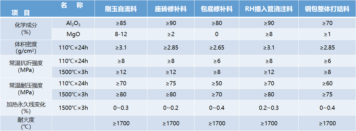 該系列產品采用剛玉、尖晶石、鎂砂等原料結合超細粉技術,具有加水量低、流動性能好、抗爆裂、抗滲透性好、熱態強度高、熱震穩定性好、抗剝落性強,施工方便快捷等特點,適用于各種鋼包的包沿和包底部位。