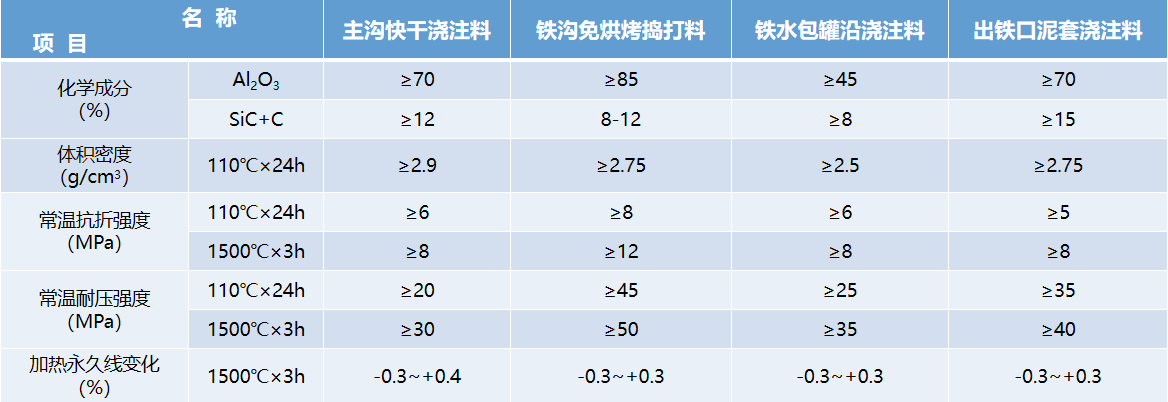 高爐出鐵溝澆注料是出鐵溝內襯的常用內襯材料,出鐵溝是鐵水的流經通道,在使用過程中受到鐵水的沖刷、鐵渣的化學侵蝕、空氣的氧化作用、溫度波動產生的熱震應力等。本產品為剛玉、質碳化硅、碳質超低水泥澆注料,主要由剛玉骨料,SiC、碳、水泥及各種添加劑配合而成,具有快速烘干和防暴裂性能,抗渣侵蝕、耐沖刷、抗氧化、長壽命、施工快捷簡便等優點。